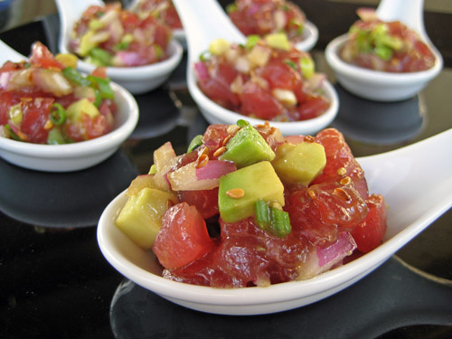- Place tuna, avocado, and red onion in a large bowl. In a small covered container, toss together vinegar, soy sauce, canola oil, sesame seeds, salt and pepper, then pour dressing over tuna and toss lightly to coat well. Refrigerate tuna tartare until ready to serve. Just before party, place a small spoonful of tuna tartare into Asian soup spoons and serve immediately.