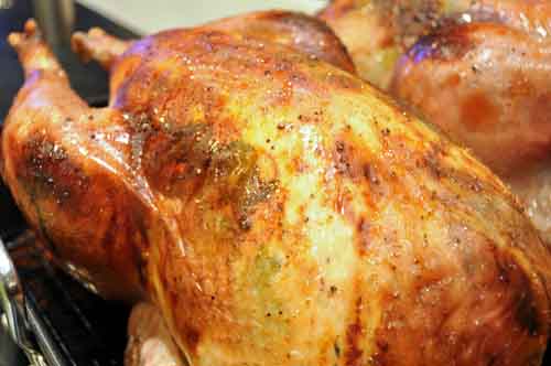 People often ask me how they taste different and it’s hard to actually describe. They have a more pronounced taste, but not gamey. They have smaller breasts than the commercially mass produced ones that are bred to have Pamela Anderson equivalents – not really healthy in a bird, and as they say in the commercial, “That’s not natural!” They are definitely leaner, which brings me to the point of this post. A heritage breed bird definitely benefits from brining. It hasn’t been shot up with saline water already like pre-packaged commercial turkeys, and that’s a good thing. Plus the beauty of brining yourself is you can flavor it any way you like. I created this one and love it. I also have a couple of other tips for getting a really moist and juicy bird: