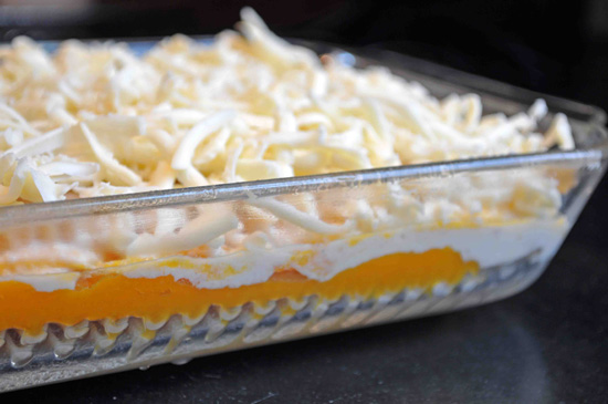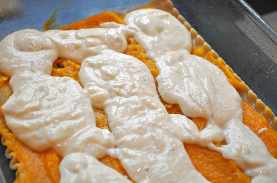While the white sauce is thickening, cook cubed butternut squash in boiling water and then puree it in the food processor. When the white sauce is thickened stir in a container of ricotta cheese to the white sauce – now you have cheese sauce! From there, it’s a simple lasagna building process.