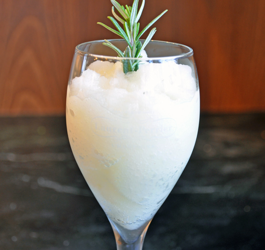 1 cup Moscato d’Asti (or other sparkling wine)Combine water, sugar and rosemary sprigs in a saucepan, bring to a boil; lower the heat to a simmer and cover for 5 minutes. Remove from heat and cool. Add the fresh lemon juice and strain the mixture discarding the rosemary. Add Moscato d’Asti and pour into a shallow container, cover and freeze until firm. Remove from freezer, puree in a blender or food processor until smooth. Put into a small bowl, cover and freeze again. When ready to plate up use a melon baller or small ice cream scoop to make 1 to 3 balls per person. Serve in a stemmed glass or dessert dish before the main course. Garnish with rosemary sprigs to serve.