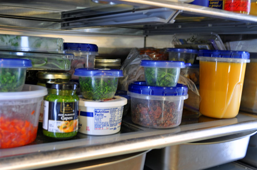 Start by selecting a menu that allows for dishes to be prepared largely in advance. Of my ten courses, 4 are completed and just need to be warmed up, 5 need a little last minute attention that I can do before jumping in the shower, and only 1 (lamb chops) needs to be cooked to order. Do as much the day before instead of the day of your event. I’d rather fall into bed tired the night before and be refreshed the day of the party. Enlist friends to help prep. Two of my best buddies spent a couple of hours here yesterday afternoon and were tireless choppers, mincers, and dicers. Then put all of your prepped ingredients into the refrigerators (I like reusable containers) in an organized fashion so you know where everything is when you need it.