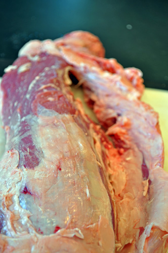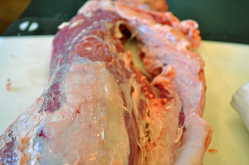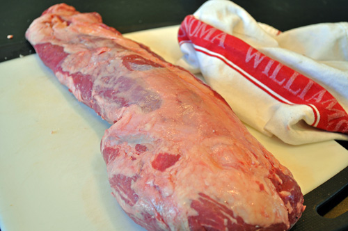When the kids are around, it seems I’m cooking alot, but almost always forgetting to snap photos of what I’m doing. I managed to get a few of the pre-cooked tenderloin, although the family was starving my Christmas dinner so I missed the final cooked shots. Still, I figured this was a good time to share my technique with you. First of all, I always buy the whole, untrimmed tenderloin because I know how to trim it and can make use of the extra beef tips I remove in the process. If you don’t want to mess with trimming it, skip the next steps and head straight for my roasting recipe below.