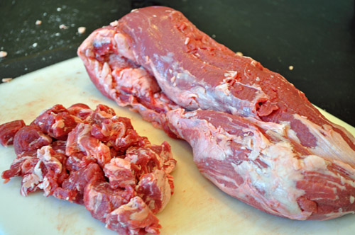 If you buy a whole tenderloin, you’ll notice a large slice of fat that runs from one end to the other. As you beging to pull this apart with a knife, you’ll see that this piece separates off, so work your way through it and cut of this piece.