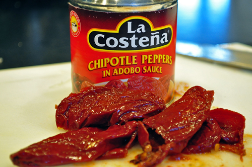 Some chipotle peppers, which are actually smoked jalapenos that come packed in a tomato-ey adobo sauce and have all the seeds in them still. If you like things really hot, keep the seeds in and mince them up. I like a bit of heat, but not too much, so just removed the seeds and minced them up.