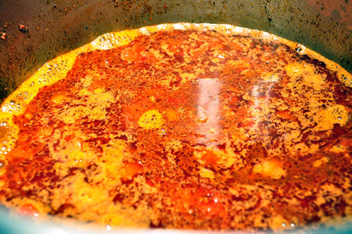Then let the whole thing simmer, partially covered to let some moisture out and allow the chili to thicken. Notice how totally soup-like this looks like right now? Not that appetizing yet. Depending on how much moisture is in your pot, it could take from one to two hours to fully thicken.