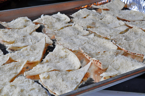 Cut the whole round pita bread in half, then stack the two halves on top of each other and cut them into quarters. This leaves you with triangular pieces, which you then want to separate into the two layers very carefully so they don’t tear. This separation into layers is what creates a light and delicate pita crisp instead of the dense alternative. Lay them out on a foil lined baking sheet – see the pattern I use so you can fit more in?