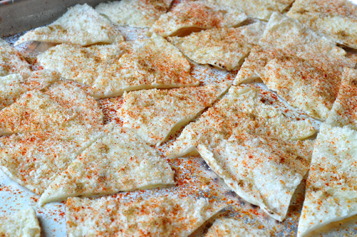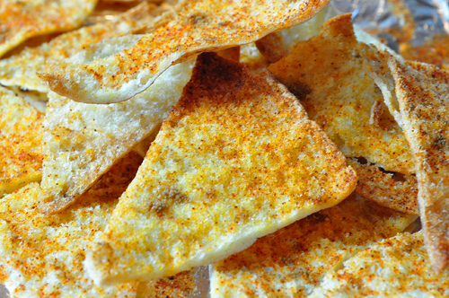 - Cut pita breads into eighths, then gently peel apart the layers to create 16 triangles from each pita bread. Lay flat on foil lined baking sheets and spray liberally with cooking spray or spray butter. (If you are using melted butter, toss the pita crisps with melted butter in a bowl.) Combine spices and sprinkle over the top of the pita bread, then bake at 375 degrees until crisp and lightly browned, about 8-10 minutes.