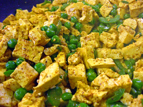 1/4 cup toasted cashews, optional, for garnishCut tofu into cubes. Heat oil in a large nonstick skillet over medium high heat. Add tofu, peas and jalapeno, and cook until peas are nearly cooked through and jalapeno is softened, about 5 minutes, stirring occasionally. Add spices and stir together, cover, and simmer for 2 minutes. Season with salt to taste. Serve with toasted cashews sprinkled on top.
