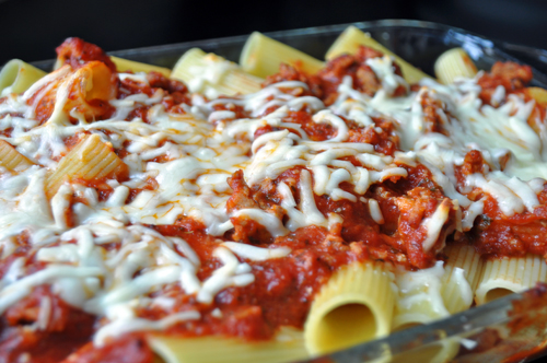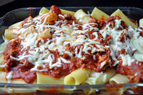 8 ounces shredded mozzarella cheeseCook and drain the pasta. While the pasta is cooking, brown the beef and sausage together in a large skillet, then stir in the sauce. Layer 1/2 of the cooked pasta in the bottom of a 9 x 11 baking dish. Top with 1/2 of the meat sauce and a sprinkling of oregano, then 1/2 of the cheese. Repeat with pasta, sauce, oregano, cheese. Bake at 375 just until cheese melts through, about 10-15 minutes. Note: when layering the sauce, leave some noodles exposed at the sides so they get a little crunchy when you bake it (see photo) – that’s Greg’s “secret” technique! If this were my recipe (and trust me it’s not) I would add some fresh basil, some Parimigiano, perhaps some ricotta, and I’d make my own sauce – but that’s just me.