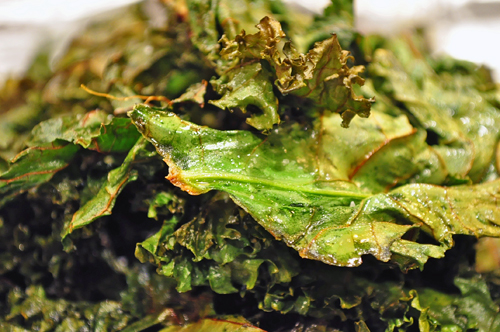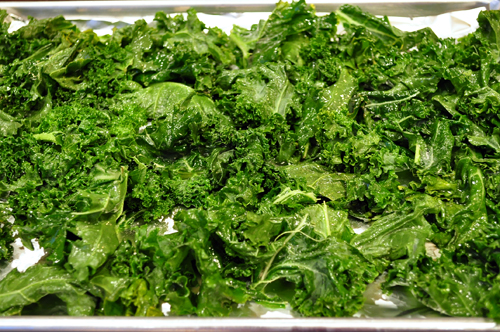 - Strip the kale leaves from the thick stalk in the middle, then tear them into bite sized pieces. Toss them in a large bowl with just enough extra virgin olive oil to lightly coat them (I used maybe 1-2 tablespoons at most on a large bowl of leaves), then spread the leaves out in as close to a single layer as possible on a baking sheet. Bake them on a low temperature, about 200-250 degrees F, to dry them out – and it doesn’t take all that long because they are thin, so check them every 10 minutes or so. Remove from the oven and sprinkle with some sea salt.