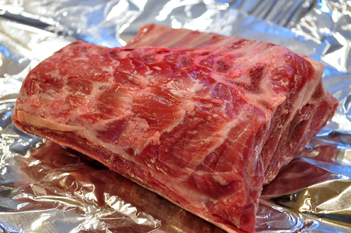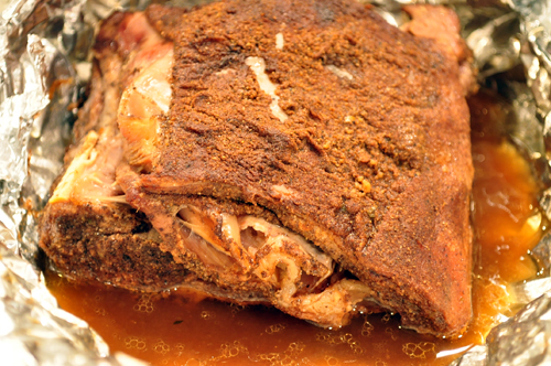I developed this technique for cooking shoulder roasts after making the chili from the cookoff I judged this summer (those of you wanting the second and third place winner recipes, I’m working on it.) Lay the shoulder roast on top of several layers of foil – enough to be able to wrap it tightly and not let any steam or juices escape.