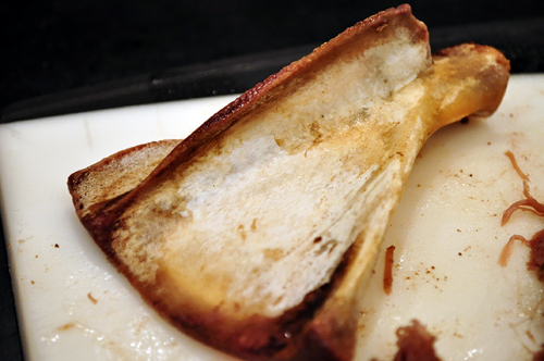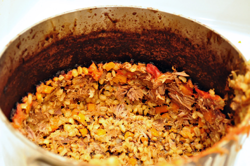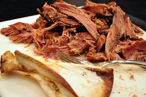 Separate the fat and bones from the meat, which I did with my hands and a fork because it was so tender. Notice how clean the bone is? That’s because the meat literally just fell off it. Return the shredded meat to a pot on the stove along with the remaining stew ingredients to simmer together.
