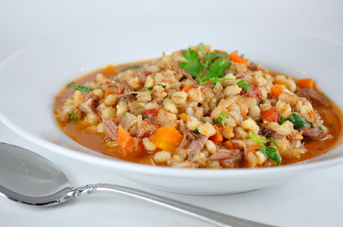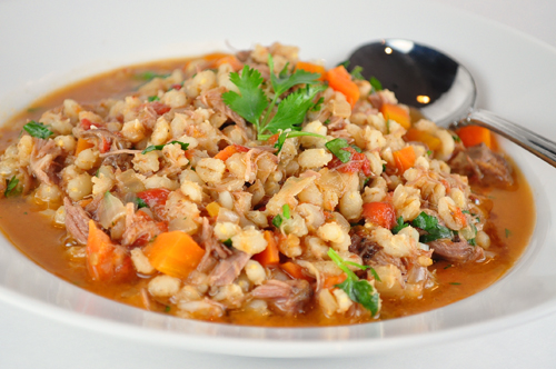 - Place shredded lamb into a stock pot along with stock, barley, carrots, onions, garlic, tomatoes and cumin. Simmer together for 30 minutes for flavors to meld and vegetables to cook. Remove from heat, season with salt and pepper to taste, and stir in cilantro before serving.