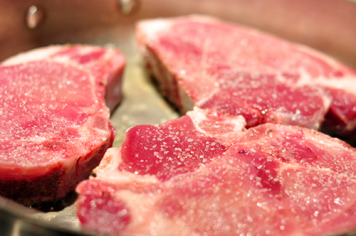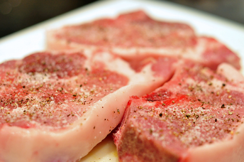 Start by patting your chops dry and sprinkling them very liberally with salt and pepper. When the only seasoning to be added is salt and pepper, you want to be sure there is enough of it.