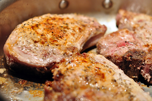 Heat your skillet to medium high and add the olive oil. When it’s shimmering hot and not a moment before, add your chops. [Did I forget to put pepper on the second side of these chops or did I just snap the shot before I did?] Sear on one side, without moving them at all, until they are nice and golden brown on the first side, about 3-5 minutes. My chops come bone-in from the farm, and cooking anything bone-in creates the most flavor. I leave the bone and all of the fat while I cook them, then cut the meat from the bone and trim the fat before serving it.