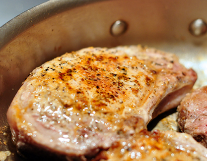 Now I remember that you’ve also purchased a pig. We’ve been in pork heaven here, too. We don’t have chops all that often, but this is pretty similar to the way I cook mine as well. I’m laughing because the whole idea of the lid going over the pan to let them cook through is how my mother taught me to cook them as well. Definitely not a great idea for chops!