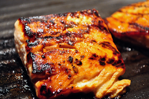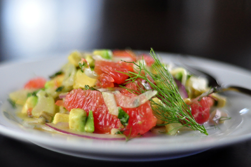 To make this gorgeous and succulent piece of fish for dinner, just brush a very small amount of agave nectar onto each side of the filet. I used about 1 teaspoon on each side, and used a pastry brush to spread it out (you could use your finger if you don’t have a pastry brush handy). Then sprinkle each side with salt and pepper and cook in a nonstick grill pan over medium heat until grill marks appear, about 3 minutes per side. Salmon retains its moisture better if cooked medium, meaning the center is still slightly darker, but if you prefer your fish cooked through, just cook it a couple of extra minutes, making sure the pan isn’t on too high of heat as it will burn with the agave coating.This fish goes perfectly with the Grapefruit and Fennel Salad with Avocado I posted a couple of days ago – just spoon a generous amount of the salad over the fish. The sweetness of the agave contrasts wonderfully with the tartness of the grapefruit.