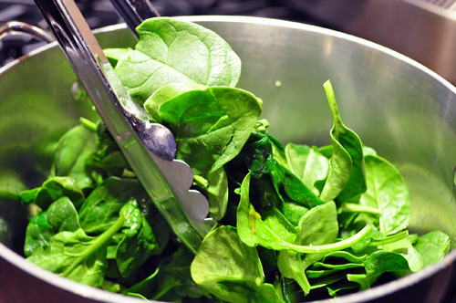 You’ll need to use a tall stock pot because it takes a large volume of raw spinach to cook down to the required amount for the sauce. As it’s beginning to cook, the easiest way to turn the spinach and get the raw stuff down to the bottom where it’s hot is to use tongs.
