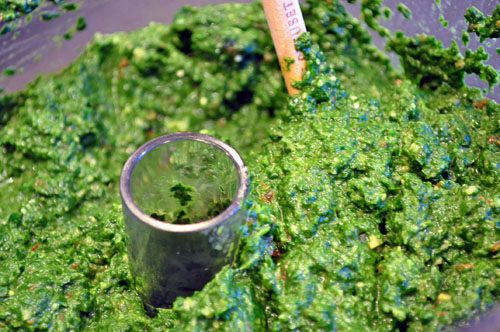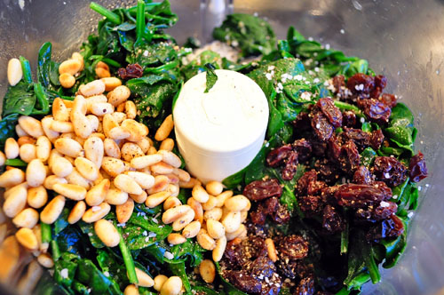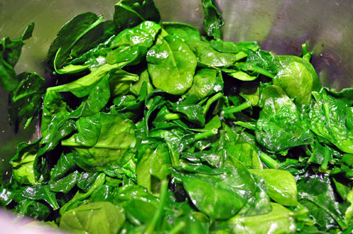 When it’s just about fully wilted, like this, pull it off the heat and transfer the wilted spinach to the food processor.