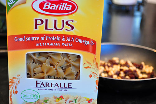 The sauce gets tossed with some cooked pasta – I like the Barilla Plus pasta (NOT a paid endorsement!) because it’s similar in consistency to white pasta with a bit more fiber and nutrition – and then topped with extra raisins and pine nuts.