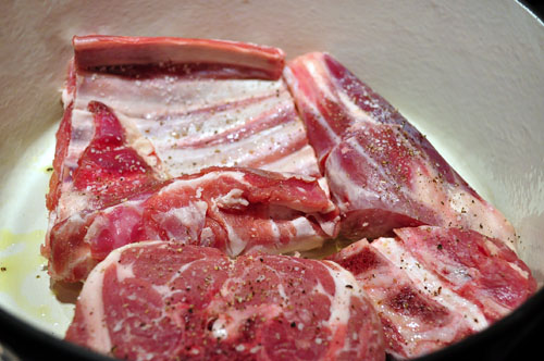 As RR would say, “into the pool” – or in this case a Dutch oven – with just a little olive oil in the pan to help them start browning, seasoned well with salt and pepper.