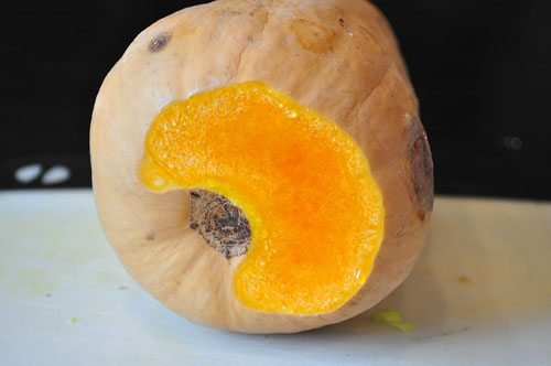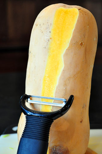 While the meat is braising, get the squash ready. It’s easiest to peel butternut squash if you first cut a small amount from the bottom so it sits flat…