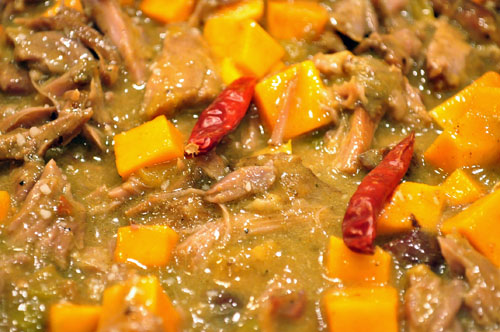 …and return it to the pot along with cubed butternut squash (or cubed potatoes, or green peas, or whatever you like). I also added two hot dried red chiles for heat, which I left whole and removed before serving. (I wanted more heat at the end so stirred in a little bit of red curry paste as well.)