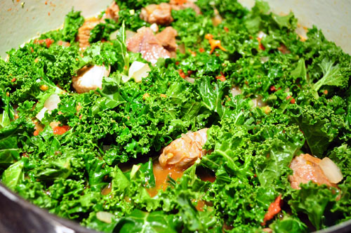 …and finally the kale. I had the stove on high at this point and kept pushing the kale into the mix until it began to soften up a bit, then covered the pot, reduced the heat, and let it simmer for about 15 minutes. Add the beans at the very end and simmer just long enough to heat them through.